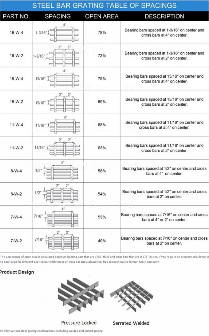 *Το ποσοστό της ανοικτής περιοχής υπολογίζεται με βάση ράβδους ρουλεμάν που έχουν πάχος 3/16 ιντσών και διασταυρούμενες ράβδους με μέγεθος 0,275 ιντσών.Εάν απαιτείται ακριβής υπολογισμός της ανοικτής περιοχής για διαφορετικά πάχους ράβδου ρουλεμάν ή μεγέθη διασταυρούμενης ράβδου, παρακαλώ να αισθάνεστε ελεύθεροι να επικοινωνήσετε με την εταιρεία Jowsun Mesh.