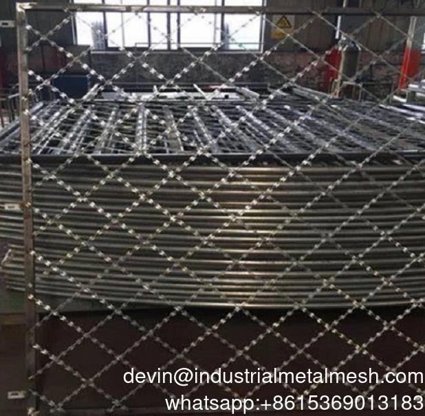 Το συγκολλημένο πλέγμα ξυραφιού είναι ένα πολυλειτουργικό, υψηλής ασφάλειας πλέγμα περίφραξης, κατασκευασμένο από ευθύγραμμες λεπίδες συγκολλημένες μεταξύ τους και σχεδιασμένο σε σχήμα διαμαντιού ή λοξού τετραγώνου, συσκευασμένο σε μορφή ρολού για μεταφορά. Το συγκολλημένο πλέγμα ξυραφιού χρησιμοποιείται σε επιχειρήσεις για την κάλυψη του πεδίου μετά την εγκατάσταση ενός φράγματος λεπίδων. Η περίφραξη χρησιμοποιείται για την προστασία εμπορικών, βιομηχανικών και κυβερνητικών ιδρυμάτων. Το προϊόν είναι σχεδόν αδύνατο να αναρριχηθεί ή να κοπεί με τυπικά εργαλεία. Αυτό το προϊόν μπορεί να σας προστατεύσει εσάς και την περιουσία σας και διασφαλίζει την ασφάλεια των προστατευτικών φραγμάτων. Αν και λειτουργεί ως παγίδα, έχει όμως μια τακτοποιημένη εμφάνιση.