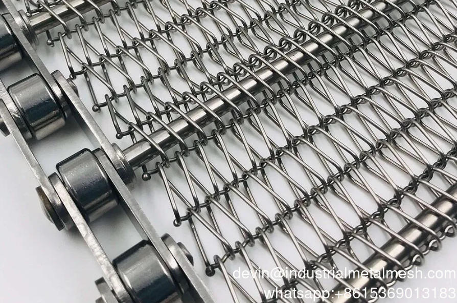Η αλυσοκίνητη ζώνη κινείται με μια εγκάρσια ράβδο που συνδέει τις αλυσίδες είτε περνώντας μέσα από είτε κάτω από το ύφασμα πλέγματος σύρματος. Η πυκνότητα του υφάσματος πλέγματος σύρματος καθορίζεται από το μέγεθος των προϊόντων.